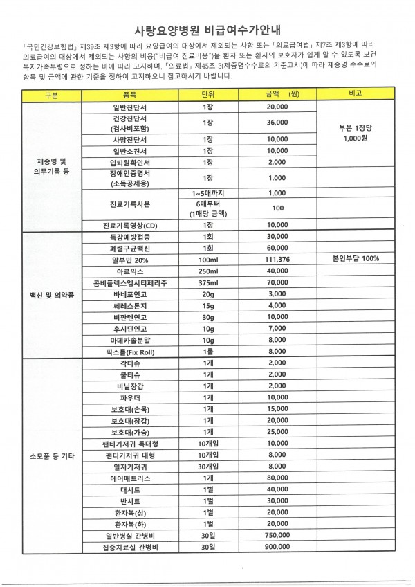 사랑요양병원 비급여수가안내