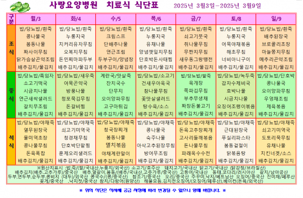 사랑요양병원 3월 첫째주 식단표