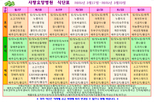 사랑요양병원 3월 셋째주 식단표