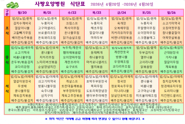 사랑요양병원 4월 넷째주 식단표