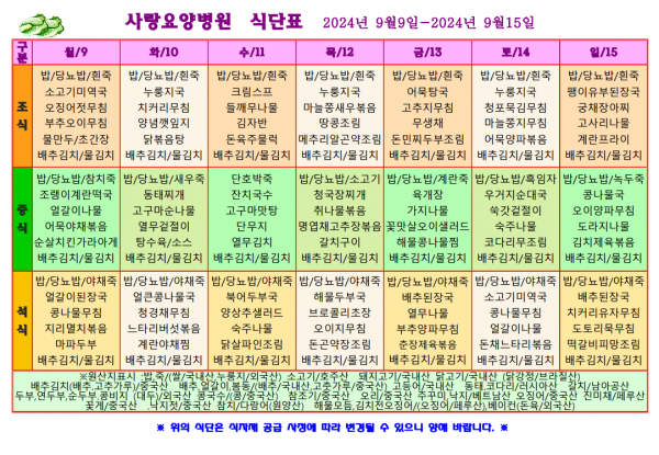 사랑요양병원 9월 둘째주 식단표