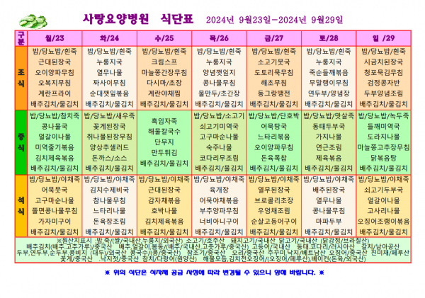 사랑요양병원 9월 넷째주 식단표