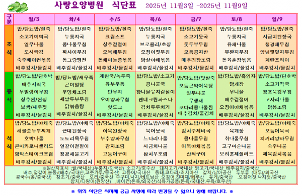 사랑요양병원 11월 첫째주 식단표