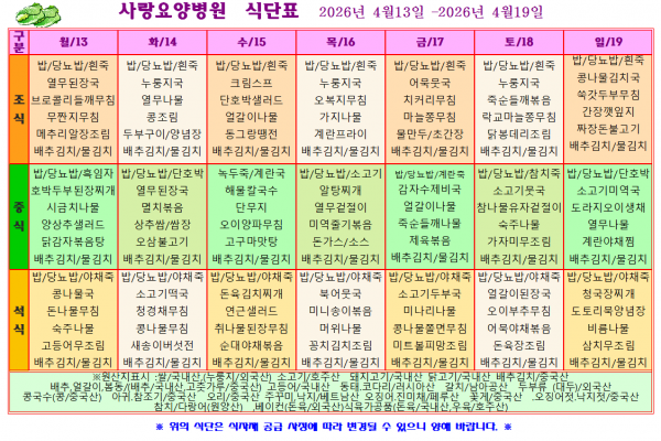 사랑요양병원 4월 셋째주 식단표